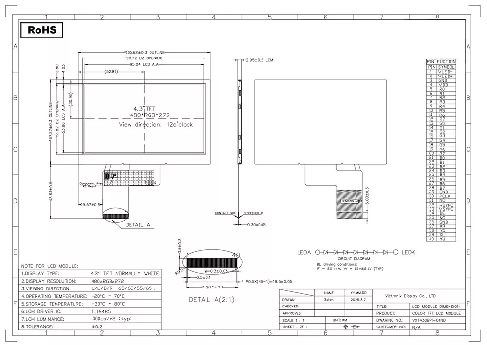 TFT skystųjų kristalų ekranas yra skystųjų kristalų ekranas, kuriame naudojama plonųjų filmų tranzistoriaus technologija, siekiant pagerinti vaizdo kokybę, ir jis turi daugybę pritaikymų kasdieniame gyvenime. Kaip profesionalus TFT modulių gamintojas ir tiekėjas Kinijoje, kas daro „Victronix“ 4,3 colio 480 × 272 pramoninio TFT modulio, kuris skiriasi nuo kitų gamintojų? Pirma, jis siūlo tipišką 300cd/m² ryškumą, platus 65 ° žiūrėjimo kampas 12 valandos kryptimi ir kontrasto santykis 700: 1, užtikrinant puikų skaitomumą įvairiais kampais. Antra, jis integruoja foninio apšvietimo bloką, kuriame naudojamas 7S1p-White šviesos diodas, kurio tipinis gyvavimo laikas yra nuo 30 000 iki 50 000 valandų (iki 50% pradinio ryškumo), užtikrinant aiškų matomumą visomis apšvietimo sąlygomis. Be to, ji palaiko RGB sąsają su ILI6485 valdikliu. Be to, jis praeina griežtus aplinkos bandymus, įskaitant šiluminį smūgį (-30 ° C ↔ +80 ° C ciklų), drėgmės kaupimą (60 ° C/90% RH) ir mechaninę vibraciją, užtikrinant, kad jis galėtų sklandžiai veikti per išplėstą temperatūros diapazoną (nuo –20 ° C iki +70 ° C).