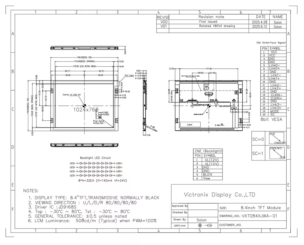 TFT skystųjų kristalų ekranas yra skystųjų kristalų ekranas, kuriame naudojama plonųjų filmų tranzistoriaus technologija, siekiant pagerinti vaizdo kokybę, ir jis turi daugybę pritaikymų kasdieniame gyvenime. Kaip profesionalus TFT modulių gamintojas ir tiekėjas Kinijoje, kas daro „Victronix“ 8,4 colio 1024 × 768 IPS TFT LCD, skiriasi nuo kitų gamintojų? Pirma, jis siūlo tipišką 500 CD/m², 85 ° pločio visų krypčių žiūrėjimo kampus, ir kontrasto santykis 1500: 1, užtikrinant puikų skaitomumą iš įvairių kampų. Antra, jis integruoja foninio apšvietimo bloką, kuriame naudojamas 32 baltas šviesos diodas, kurio įprastas 50 000 valandų (iki 50% pradinio ryškumo) gyvavimo laikas užtikrina aiškų matomumą visomis apšvietimo sąlygomis. Be to, jis palaiko LVDS sąsają su ESD apsauga ir JD9168S valdikliu. Be to, jis praeina griežtus aplinkos bandymus, įskaitant šiluminį smūgį (-30 ° C ↔ +80 ° C ciklų), drėgmės kaupimą (60 ° C/90% RH) ir mechaninę vibraciją, užtikrinant, kad ji sklandžiai veiktų per išplėstą temperatūros diapazoną (nuo –30 ° C iki +80 ° C).